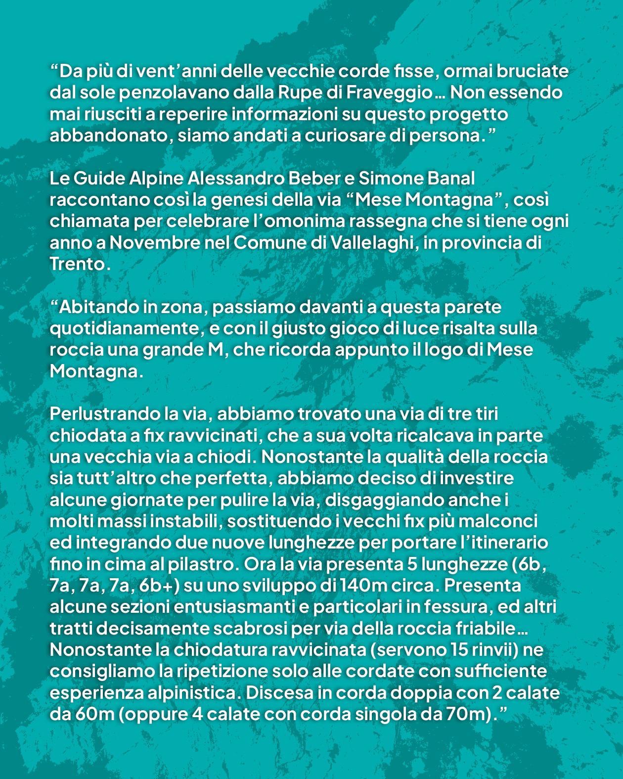 Le Guide Alpine Alessandro Beber e Simone Banal raccontano così la genesi della via “Mese Montagna”, così chiamata per celebrare l’omonima rassegna che si tiene ogni anno a novembre nel Comune di Vallelaghi, in provincia di Trento.