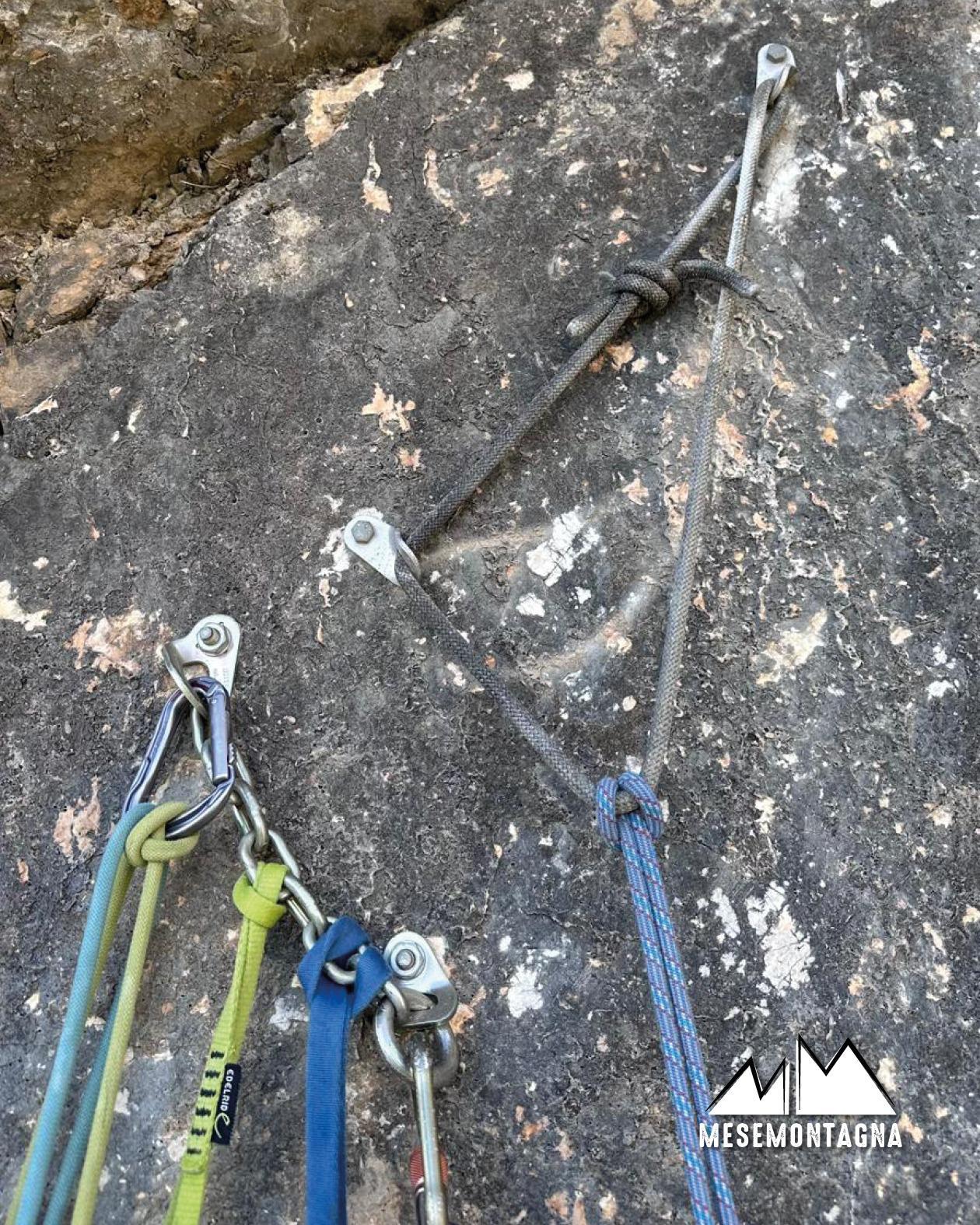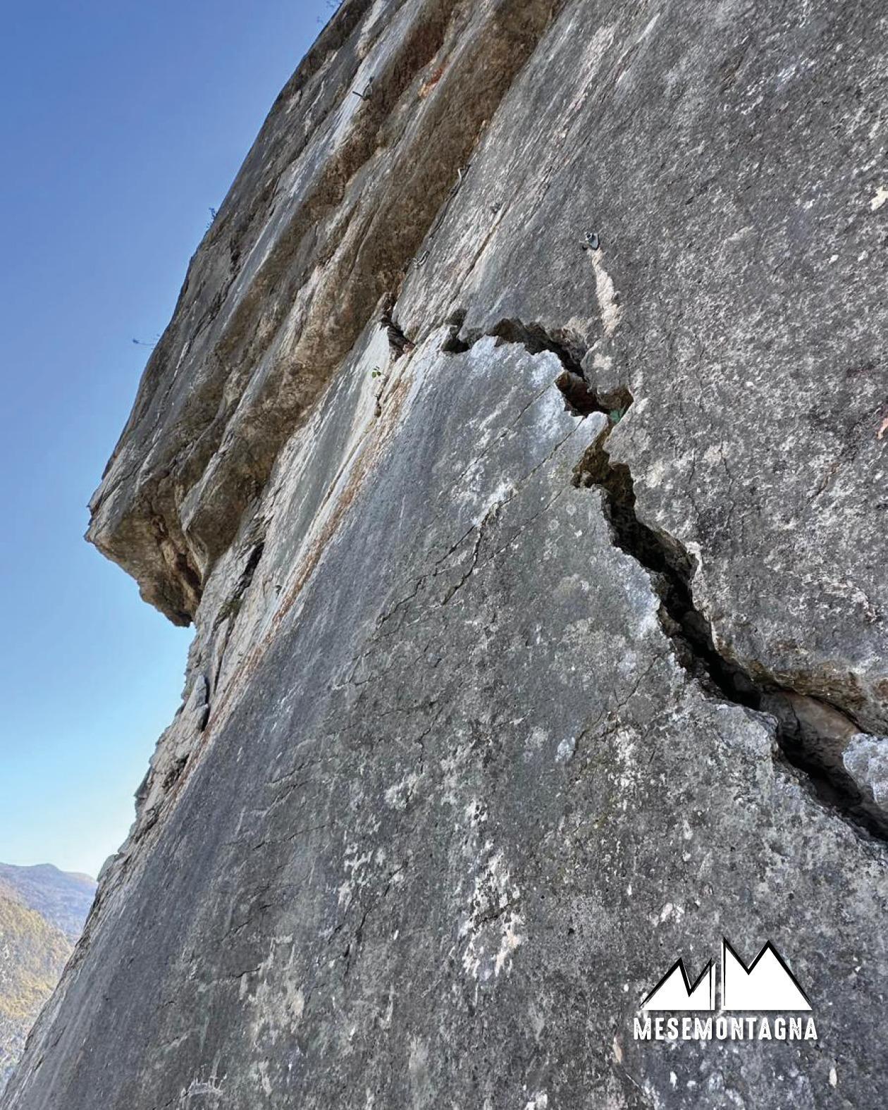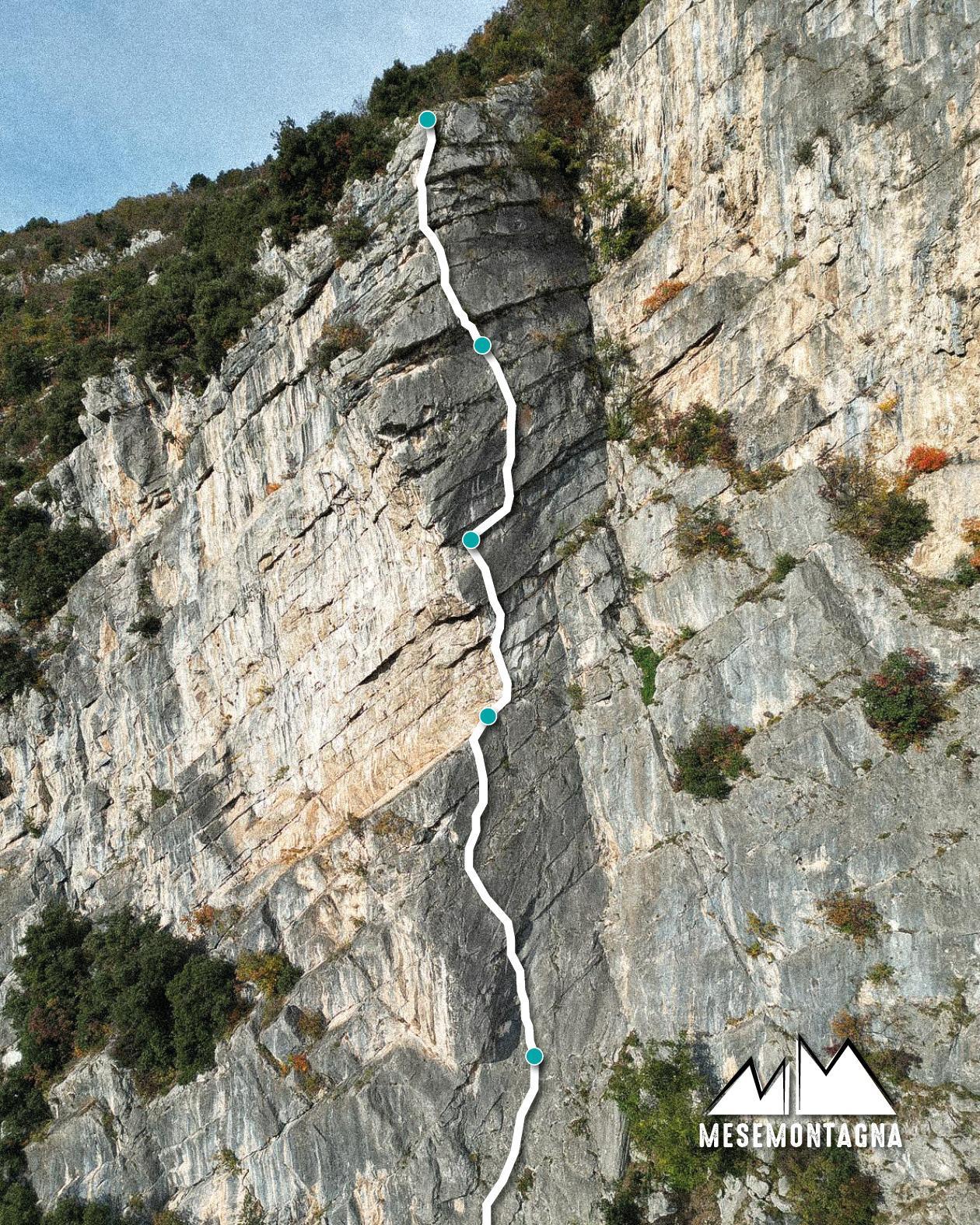 Perlustrando la via, abbiamo trovato una via di tre tiri chiodata a fin ravvicinati, che a sua volta ricalcava in parte una vecchia via a chiodi. Nonostante la qualità della roccia sia tutt’altro che perfetta, abbiamo deciso di investire alcune giornate per pulire la via, disagiando anche i molti massi instabili, sostituendo i vecchi fix più malconci fino in cima al pilastro. Ora la via presenta 5 lunghezze (6b, 7a, 7a, 7a, 6b+) su uno sviluppo di 140m circa. Presenta alcune sezioni entusiasmanti e particolari in fessura, ed altri tratti decisamente scabrosi per via della roccia friabile… Nonostante la chiodatura ravvicinata (servono 15 rinvii) ne consigliamo la ripetizione solo alle cordate con sufficiente esperienza alpinisti. Discesa in corda doppia con 2 calate da 60m (oppure 4 calate con corda singola da 70m).”